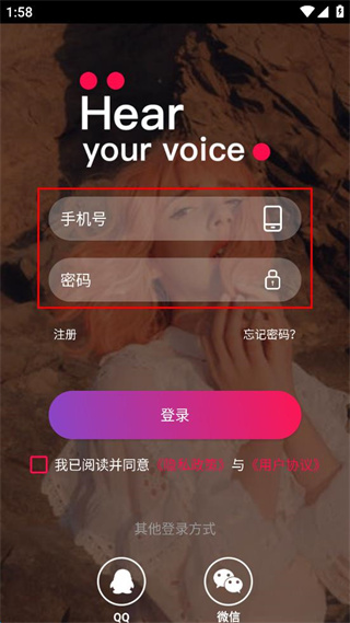 3、在登錄界面,輸入手機(jī)號和密碼。