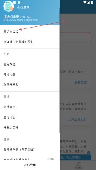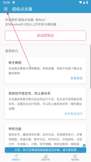 1、打開超級(jí)點(diǎn)擊器應(yīng)用,點(diǎn)擊界面左上角的三條橫線菜單按鈕,展開側(cè)邊欄菜單。