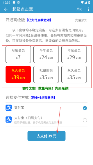 3、在高級(jí)版激活頁(yè)面,選擇所需的會(huì)員套餐,然后點(diǎn)擊去支付按鈕。