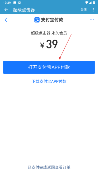 4、進(jìn)入支付寶付款頁(yè)面后,點(diǎn)擊打開支付寶APP付款按鈕,通過(guò)支付寶完成付款。