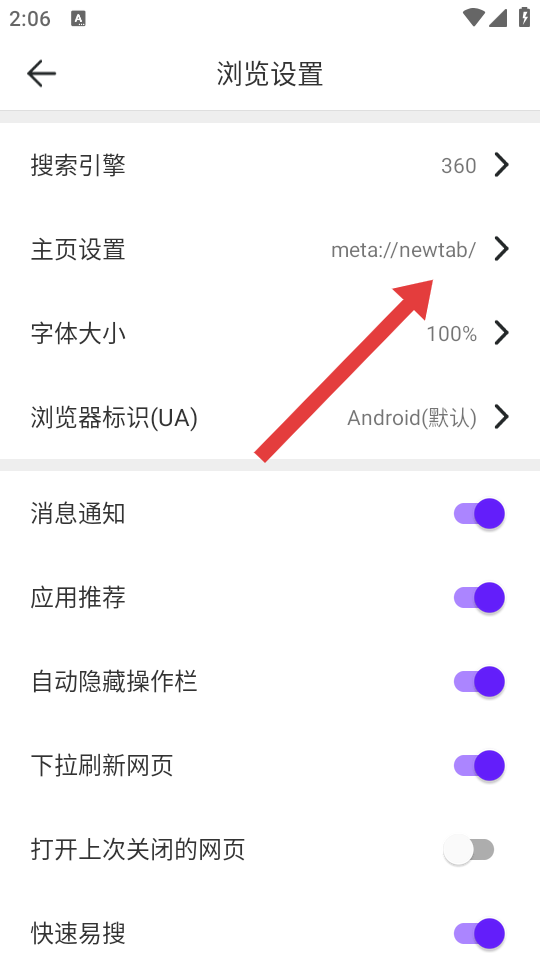 2、在瀏覽設(shè)置的頁面中,點擊主頁設(shè)置的選項,然后進入主頁設(shè)置的界面。