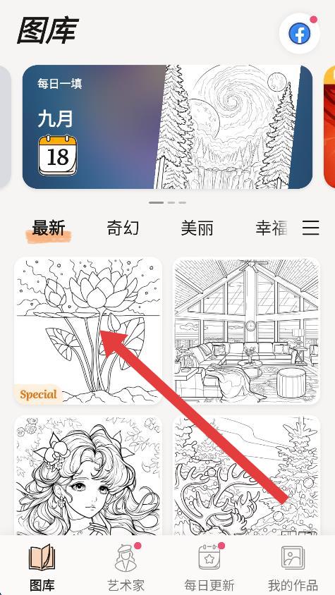 1、打開樂涂數(shù)字填色應(yīng)用,選擇想要填色的圖案,點(diǎn)擊進(jìn)入填色頁面。