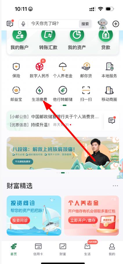1、打開中國郵政軟件,進入首頁,在功能列表中點擊生活繳費選項。