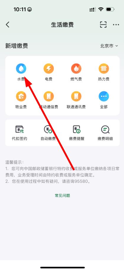 2、進入生活繳費頁面后,點擊水費或其他需要繳納的費用選項,如電費、燃氣費等。