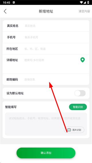4、在新增地址頁面,填寫詳細信息后,點擊確認添加即可添加新地址信息。