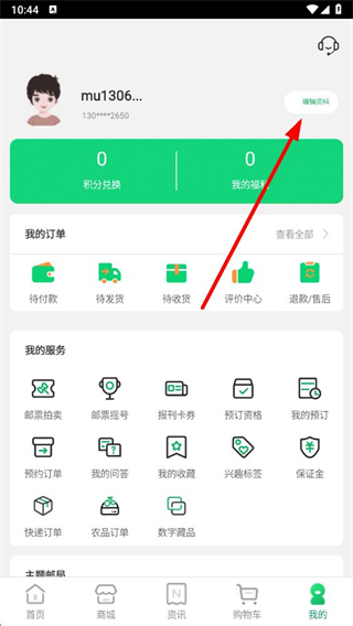 1、打開中國郵政APP,在我的頁面點擊編輯資料選項。