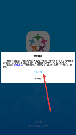 1、打開(kāi)資助通APP,彈出隱私政策說(shuō)明彈窗,點(diǎn)擊同意并接受,確認(rèn)遵循隱私條款,進(jìn)入學(xué)生登錄界面。