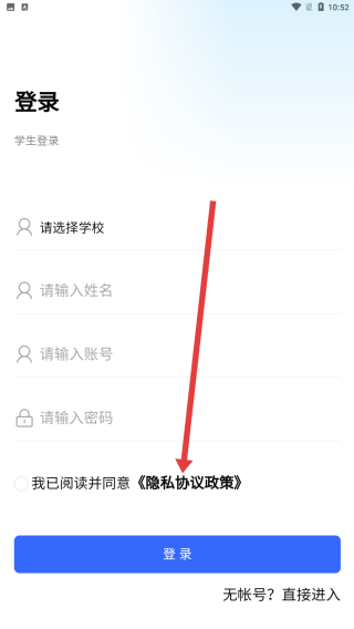 2、在學(xué)生登錄頁(yè)面,找到我已閱讀并同意《隱私協(xié)議政策》選項(xiàng),點(diǎn)擊勾選,滿(mǎn)足登錄的協(xié)議確認(rèn)條件。