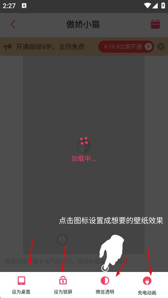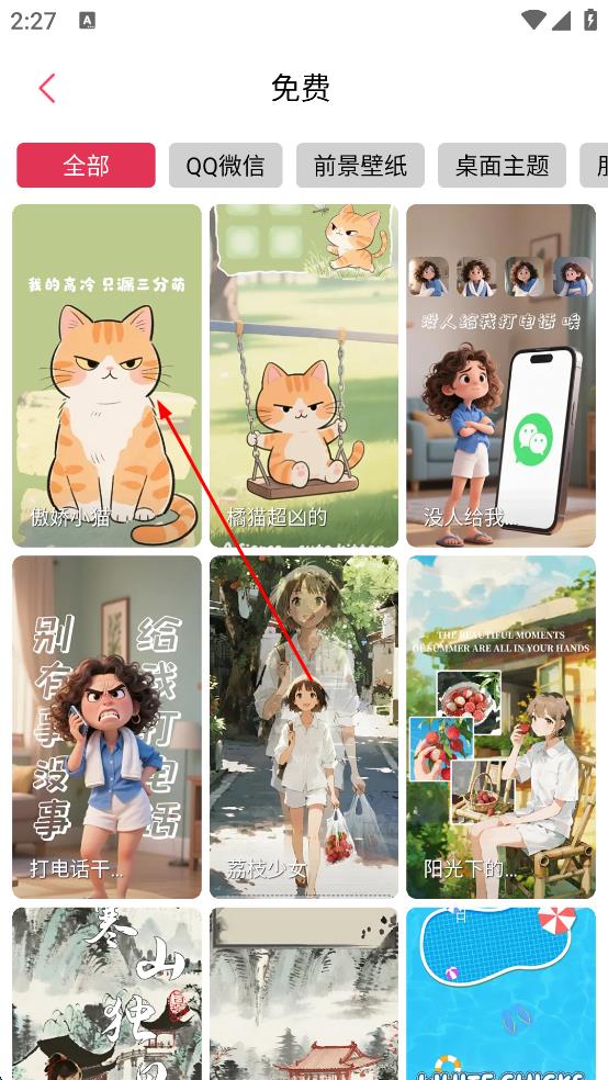 1、打開應(yīng)用進(jìn)入首頁,點(diǎn)擊底部“壁紙”選項(xiàng),瀏覽免費(fèi)壁紙分類,找到心儀的“傲嬌小貓”壁紙并點(diǎn)擊進(jìn)入詳情頁。