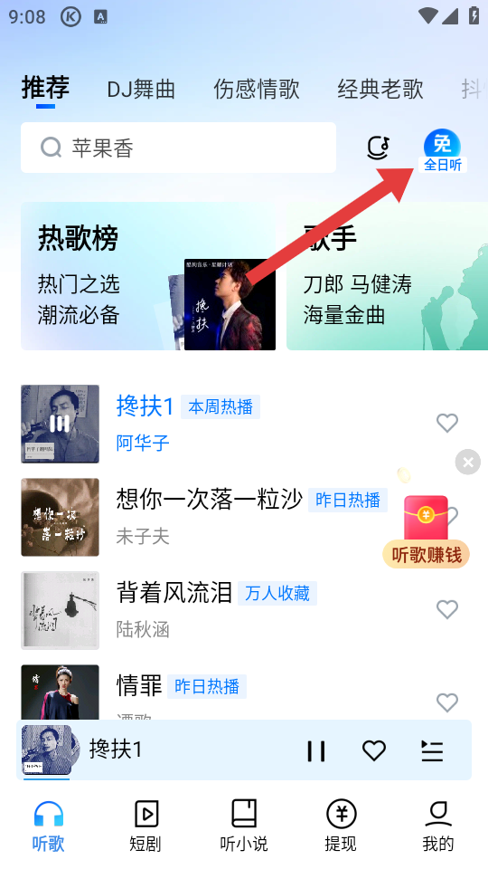 1、打開酷狗大字版APP,在首頁找到并點(diǎn)擊全日聽按鈕,觸發(fā)免費(fèi)聽歌權(quán)益彈窗。
