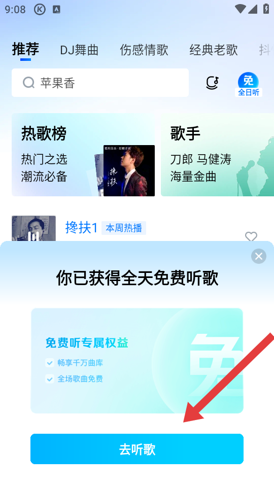 2、在彈出的你已獲得全天免費(fèi)聽歌的彈窗中,點(diǎn)擊去聽歌,進(jìn)入歌曲播放準(zhǔn)備流程。