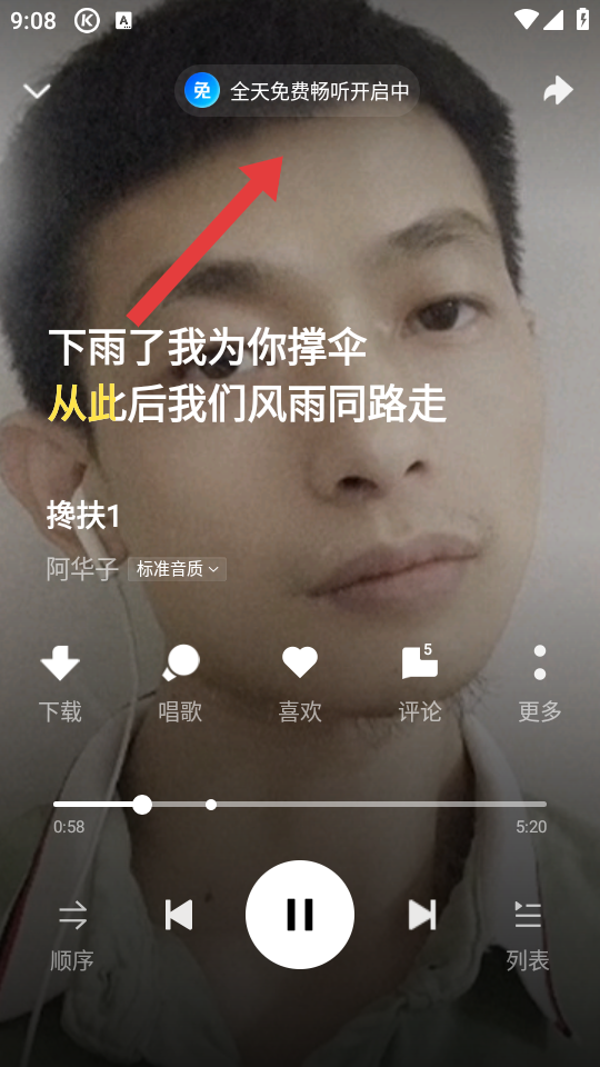 3、進(jìn)入歌曲播放界面后,界面顯示全天免費(fèi)暢聽開啟中,即可免費(fèi)播放歌曲,享受音樂。
