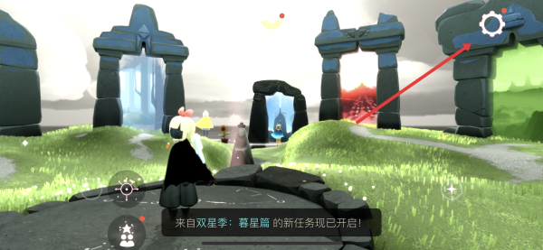1、進入光遇游戲,在遇境場景中,點擊屏幕右上方的齒輪設(shè)置圖標(biāo),打開設(shè)置菜單。