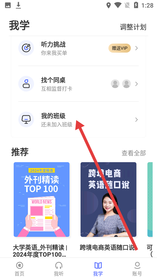 1、打開每日英語聽力APP,點擊底部的我學,進入頁面后點擊我的班級。