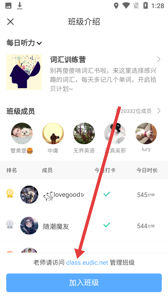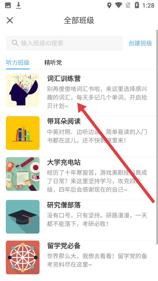 2、在全部班級頁面,瀏覽選擇想要加入的班級,如詞匯訓練營。