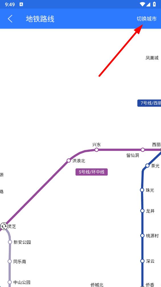 3、進(jìn)入地鐵路線界面后,點(diǎn)擊右上角的切換城市按鈕,可選擇你想要查看地鐵線路的城市。
