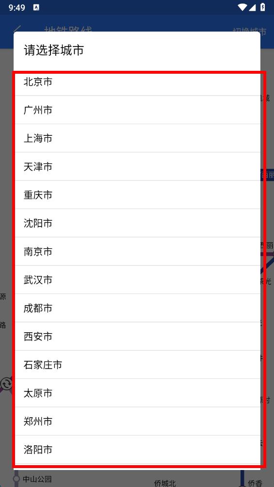 4、在彈出的城市選擇列表中,點(diǎn)擊目標(biāo)城市,即可查看該城市的地鐵線路圖,了解具體站點(diǎn)及線路走向。