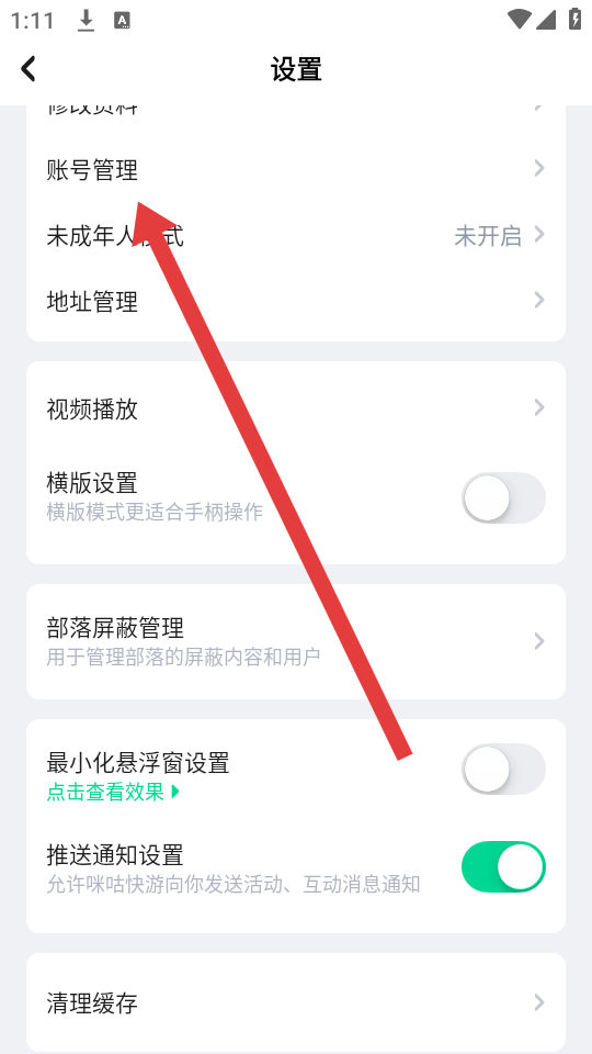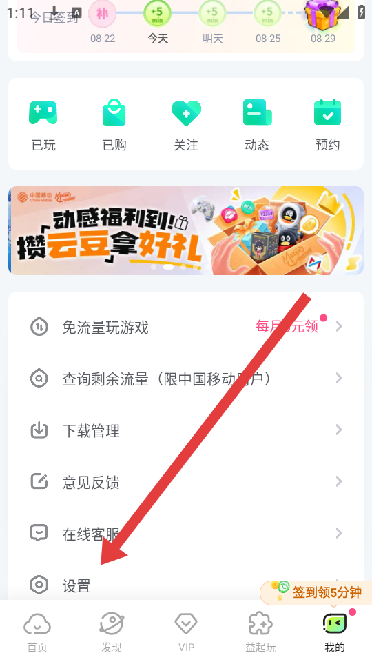 1、進(jìn)入咪咕快游我的頁面,需要下滑找到并點(diǎn)擊設(shè)置的選項(xiàng),這是進(jìn)入賬號(hào)管理的前置操作。