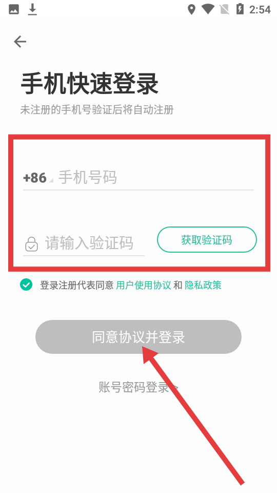 2、在手機快速登錄頁面中,輸入手機號并獲取驗證碼填入,然后點擊同意協(xié)議并登陸。