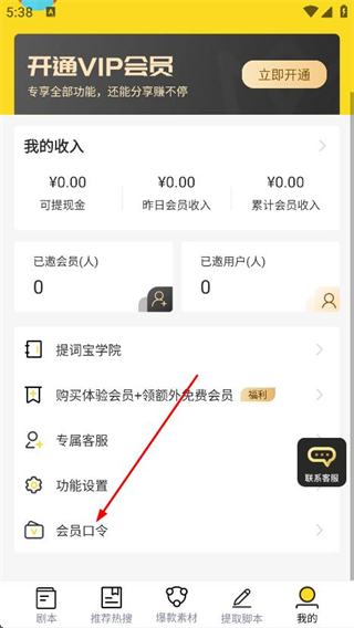 2、在我的頁面,找到并點(diǎn)擊下方的會員口令選項(xiàng)。
