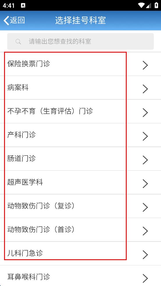3、在掛號頁面,進(jìn)入“選擇掛號科室”界面,可看到眾多科室選項,根據(jù)自身需求挑選對應(yīng)的科室。