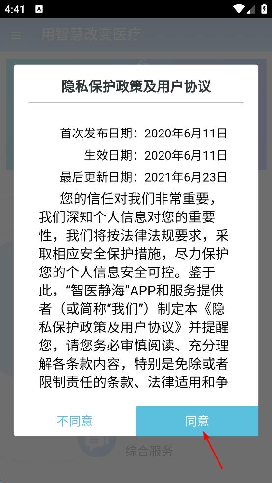 1、打開“智醫(yī)靜?!避浖?,彈出“隱私保護(hù)政策及用戶協(xié)議”提示框,仔細(xì)閱讀相關(guān)內(nèi)容后,點擊“同意”按鈕,進(jìn)入軟件主界面。