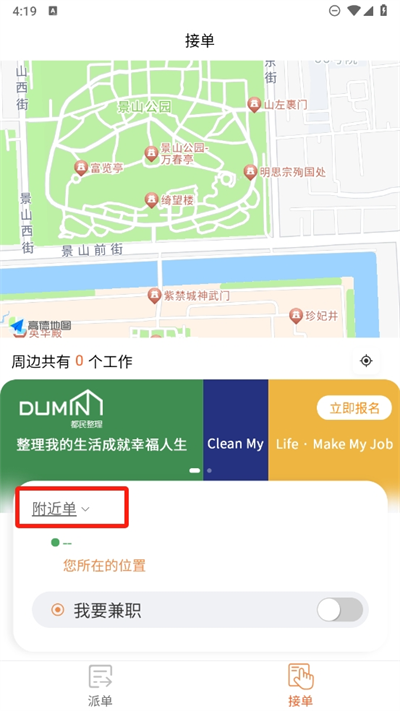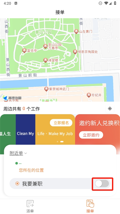 4、設(shè)置好自己想要的接單模式后,即可在接單這里開啟就能在附近找尋派單的信息并一鍵接單即可。