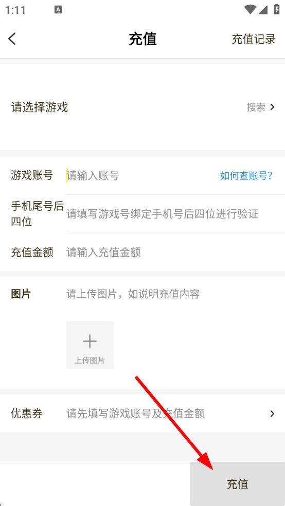 3、進(jìn)入游戲充值界面,依次填寫游戲賬號(hào)、手機(jī)尾號(hào)后四位、充值金額 等信息,確認(rèn)信息無(wú)誤后,點(diǎn)擊充值按鈕完成充值操作。