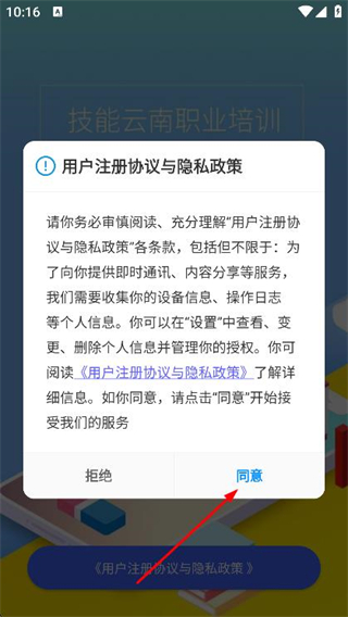 1、打開技能云南平臺app,在彈出的提示框中,點擊同意按鈕。