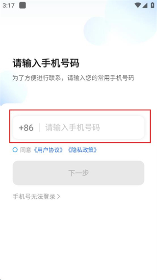 2、在輸入框填寫手機號,勾選同意用戶協(xié)議和隱私政策,點擊下一步按鈕推進流程。