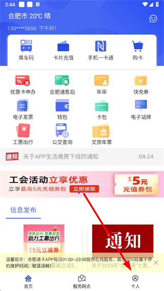 1、打開(kāi)合肥通卡APP,點(diǎn)擊右下角個(gè)人進(jìn)入個(gè)人頁(yè)面。