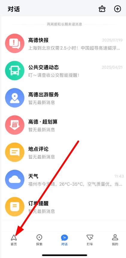 1、打開高德地圖APP,點擊底部導(dǎo)航欄中的首頁。