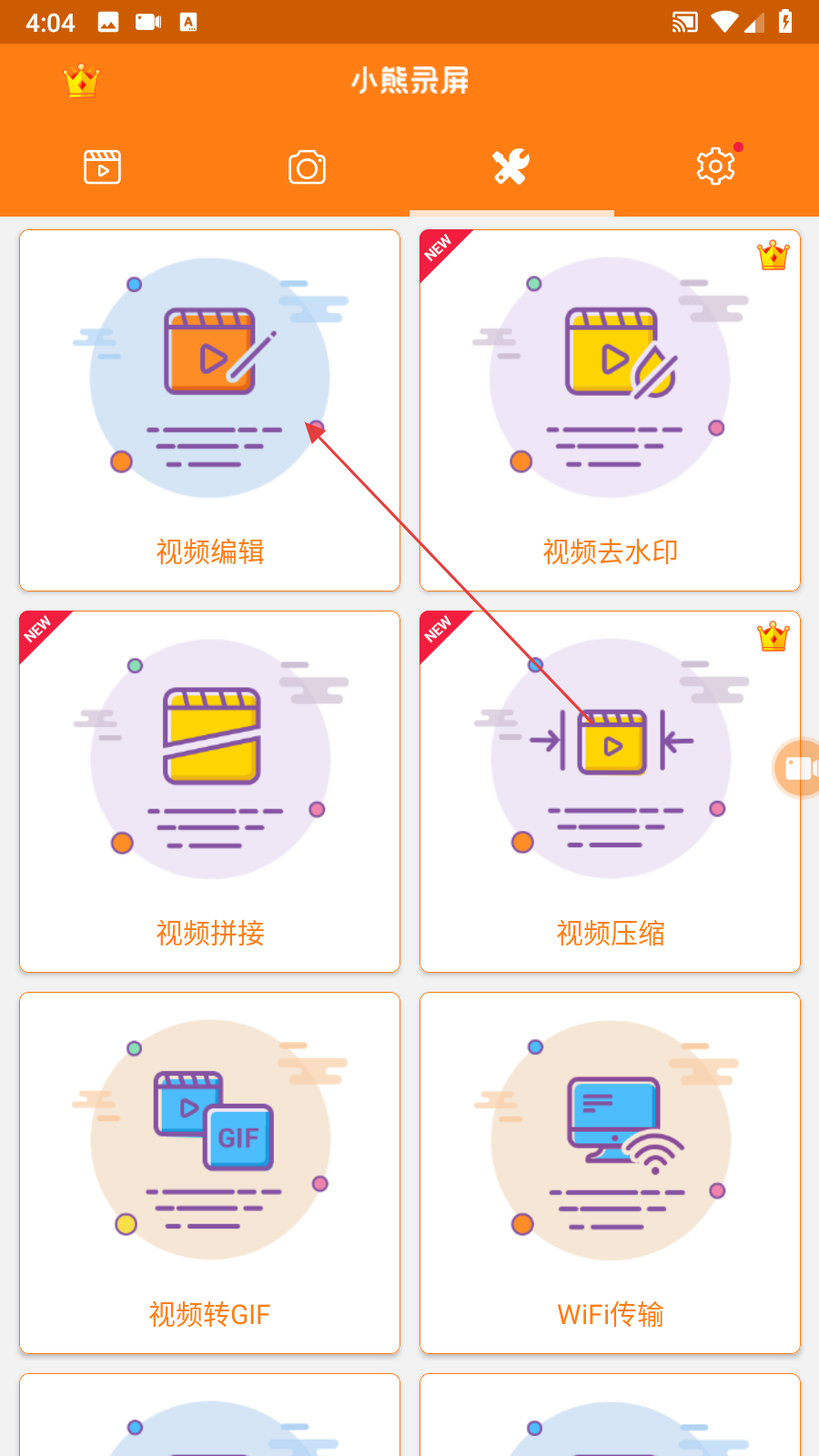 1、打開小熊錄屏應(yīng)用,在功能頁(yè)面中點(diǎn)擊視頻編輯選項(xiàng),進(jìn)入視頻和圖片選擇頁(yè)面。