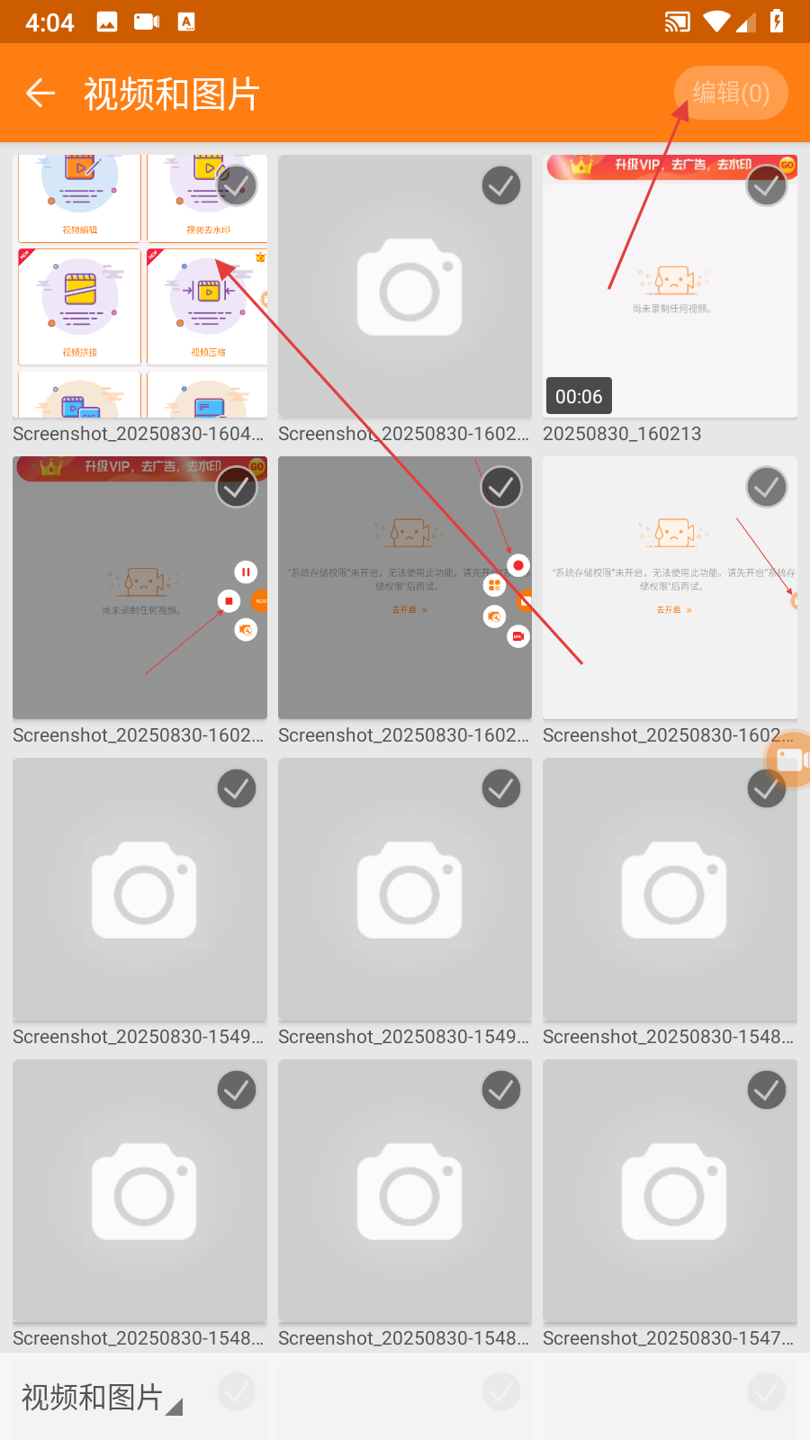 2、在視頻和圖片選擇頁(yè)面中,勾選需要剪輯的視頻,點(diǎn)擊右上角編輯按鈕,進(jìn)入視頻編輯界面。