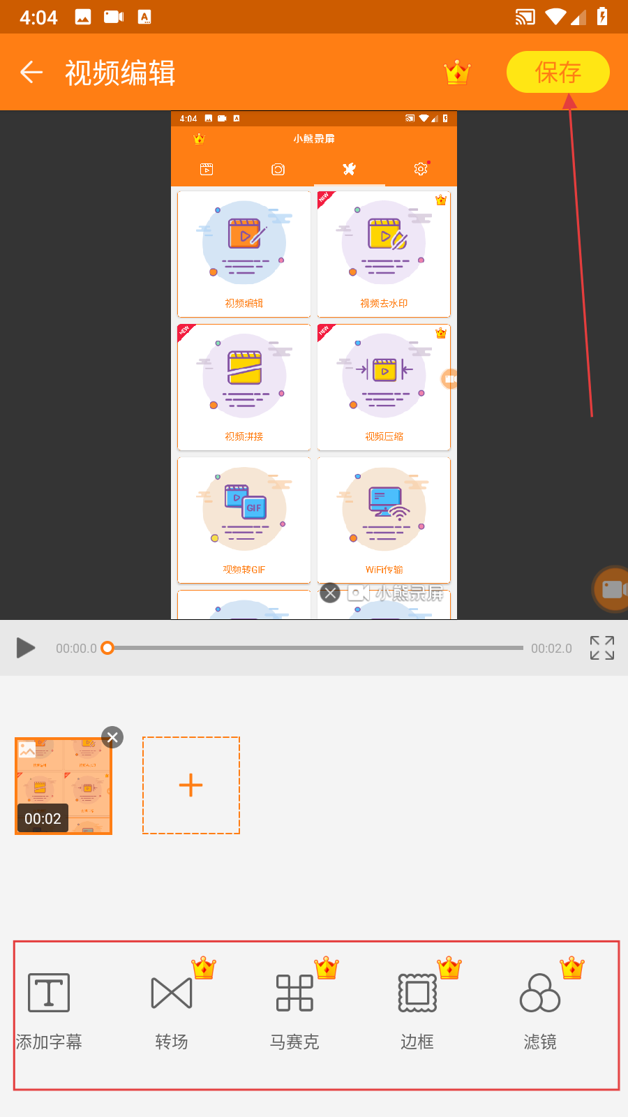 3、在視頻編輯界面中,使用底部的剪輯工具對(duì)視頻進(jìn)行編輯,編輯完成后點(diǎn)擊右上角保存按鈕,完成視頻剪輯操作。