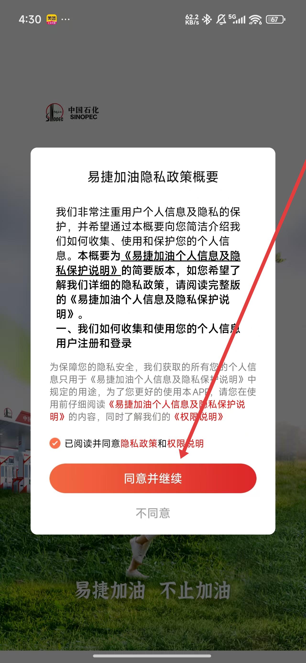 1、打開中國石化app,點擊彈窗中的同意并繼續(xù)按鈕,開始進入使用。