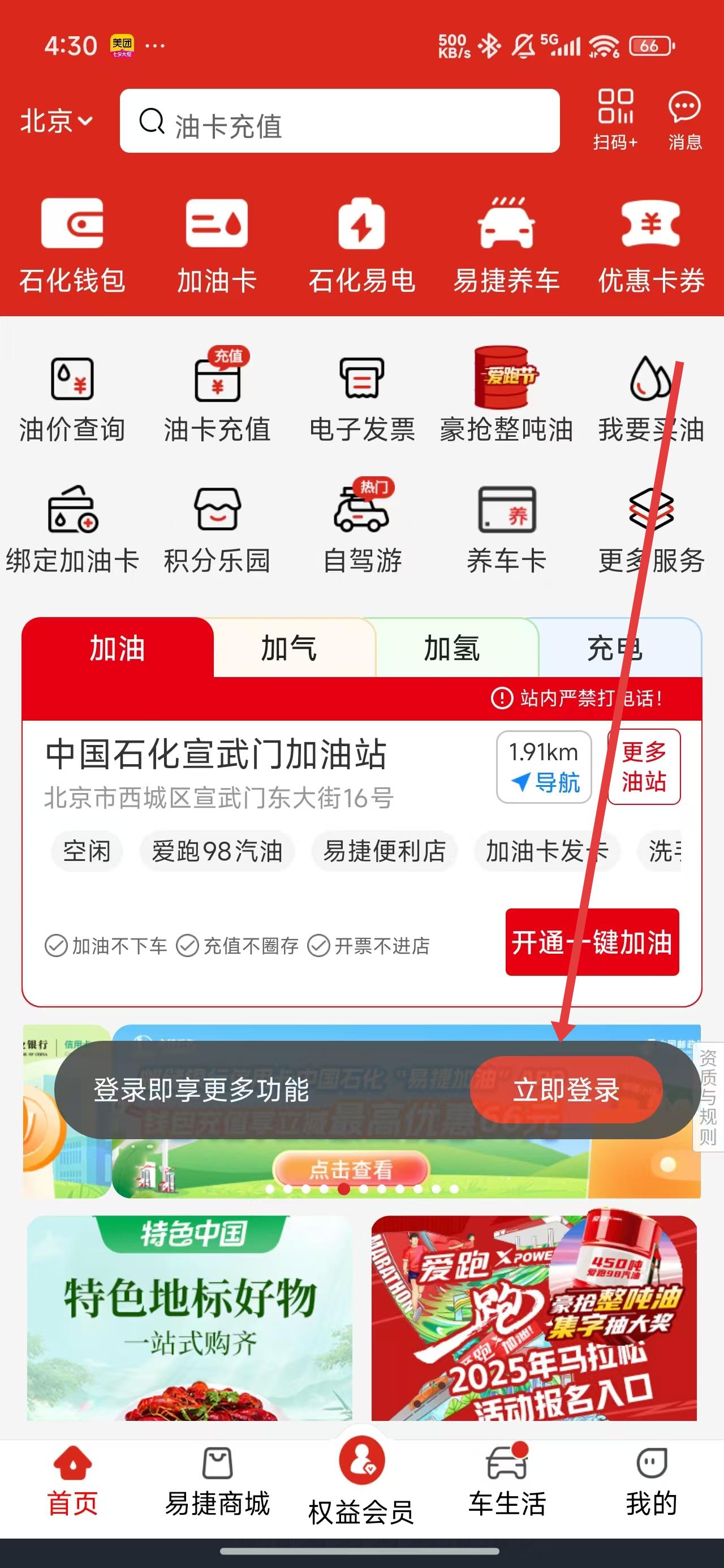 2、在中國石化app的首頁中,可以點擊彈窗中的立即登錄按鈕,登錄賬號。