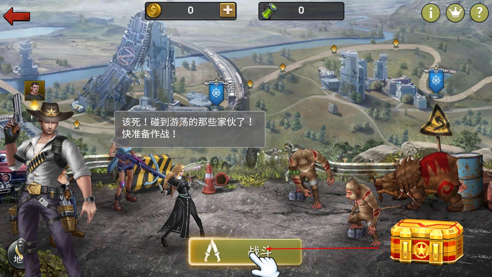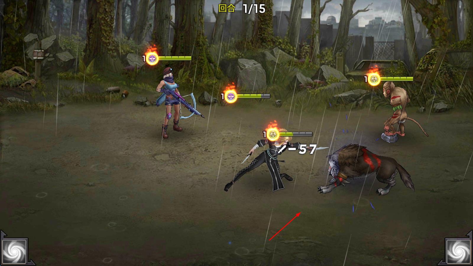 1、進(jìn)入游戲地圖界面,遇到游蕩怪物后,點(diǎn)擊下方“戰(zhàn)斗”按鈕,觸發(fā)戰(zhàn)斗場景,角色自動(dòng)進(jìn)入戰(zhàn)斗準(zhǔn)備狀態(tài)。