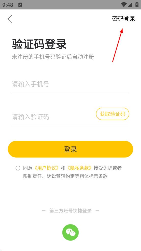 2、進入登錄頁面,在頁面右上角找到密碼登錄選項,點擊密碼登錄。