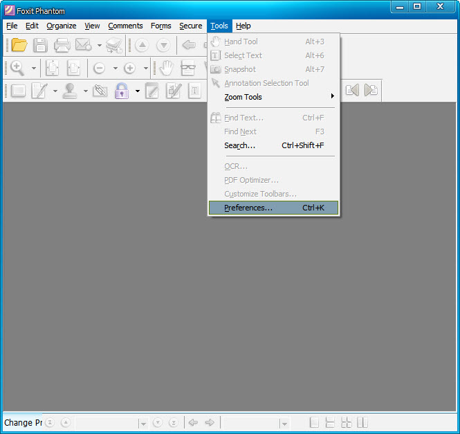 打開Foxit Phantom,在Tools 菜單欄里找到Preferences,如下圖: