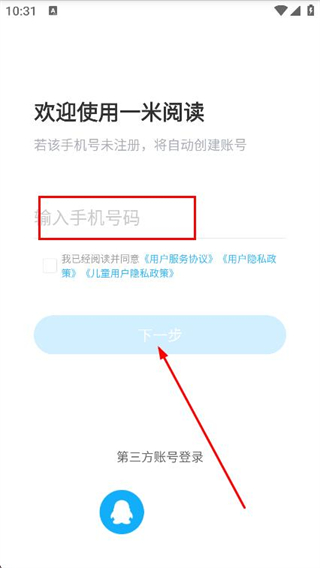 2、在登錄頁面,在輸入框內(nèi)填寫手機號碼,點擊下一步按鈕。