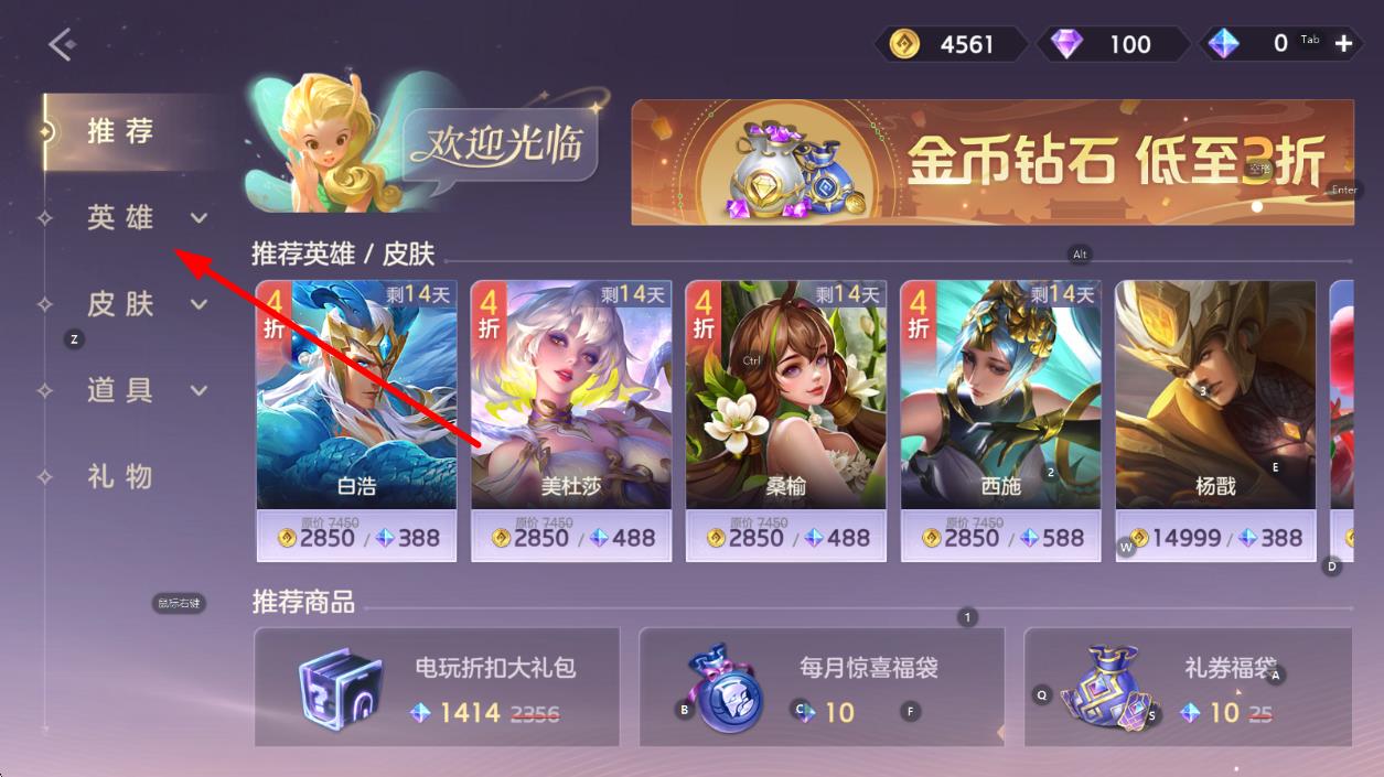2、進入商城后,點擊左側列表中的英雄選項-進入英雄購買界面。