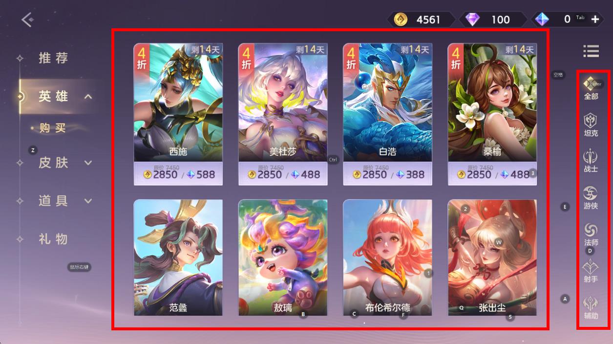 3、在英雄購買界面,右側有不同職業(yè)等英雄分類欄,可按需篩選想要購買的英雄,確認后消耗對應貨幣完成購買。