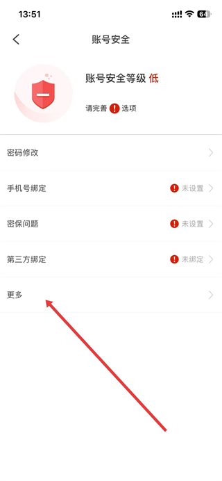 4、在賬號安全頁面,找到并點(diǎn)擊下方更多選項(xiàng)。