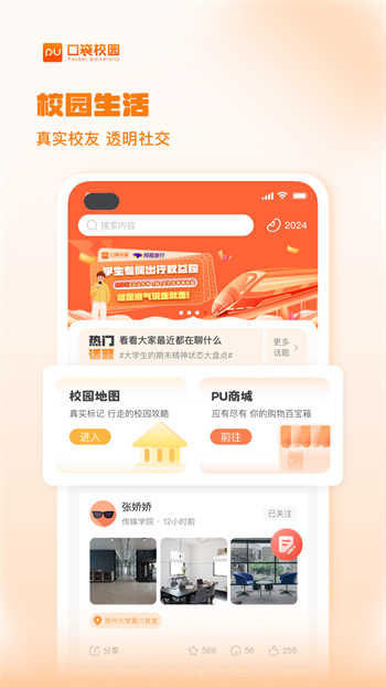 pu口袋校園最新版本簡稱PU,是一款專門針對高校大學(xué)生的實(shí)名制互動網(wǎng)絡(luò)平臺,軟件旨在為高校大學(xué)生們提供學(xué)習(xí)、生活、娛樂等各項(xiàng)服務(wù)!致力于高校,服務(wù)于學(xué)生,集活動、校園部落、課件、迎新、互動等多頻道及應(yīng)用為一體,不開放注冊,每個學(xué)生通過自己的學(xué)號登錄,PU主要由網(wǎng)站、客戶端兩大組成部分。需要的朋友快來下載吧!