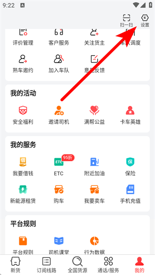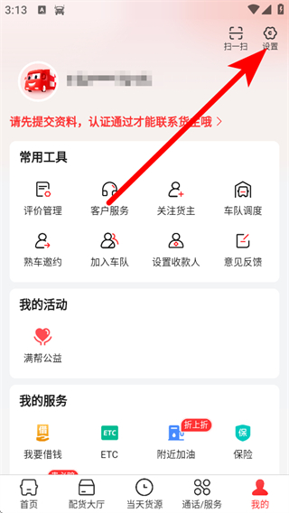 1、打開運(yùn)滿滿司機(jī)APP,進(jìn)入我的頁面,點擊設(shè)置進(jìn)入設(shè)置界面。