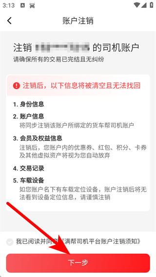3、在賬戶注銷說明的頁面,需要點擊下一步,進(jìn)入注銷原因選擇頁面。