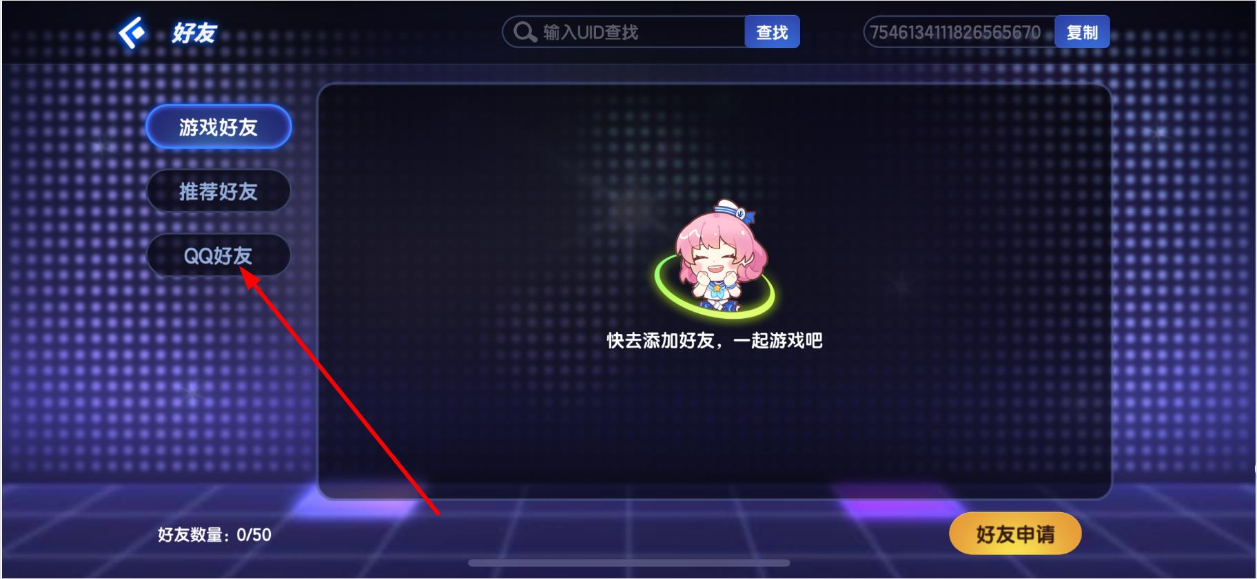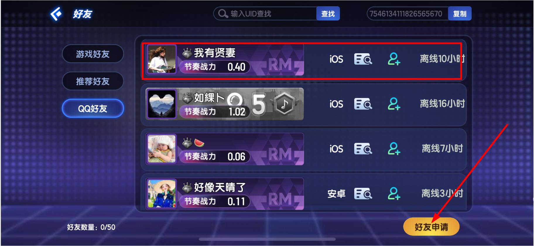 4.選中好友后點擊下方的好友申請按鈕,即可發(fā)送好友申請。