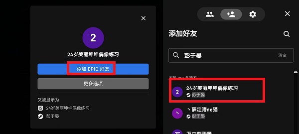 5、搜索到對方之后直接點擊對方的名字,然后左邊就會彈出來對方的賬戶,點擊【添加epic好友】即可完成添加好友操作。
