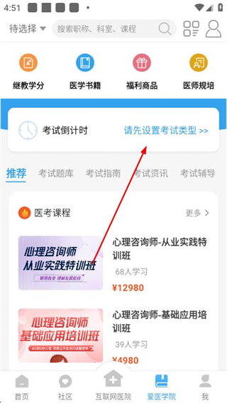 2、在愛醫(yī)學(xué)院頁面點擊請先設(shè)置考試類型,進(jìn)入考試科目選擇頁面。
